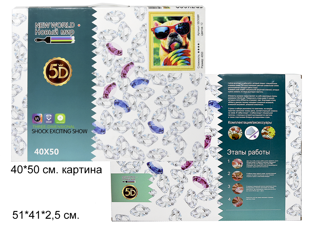 Комплект: клеевая тканевая основа, акриловые клеевые стразы, блюдце для страз, карандаш-стилус, инструкция.