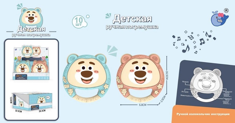 Первая игрушка малыша - это погремушка. С её помощью малыш знакомится со звуками, формами, цветами. Игрушка развивает у ребёнка слуховое, зрительное и тактильное восприятие. Звук появляется при встряхивании. А силиконовый прорезыватель поможет легче появиться первым зубкам.