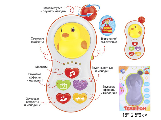 Размер игрушки: 14,5 х 6,5 х 2,5 см161.77 руб. 323.54 руб. - Телефон арт. 6688-4" "Цыпленок" на батарейках в коробке 18*12,5*6×Телефон арт. 6688-4" "Цыпленок" на батарейках в коробке 18*12,5*6Красочный обучающий телефон для малышей с цыпленком.