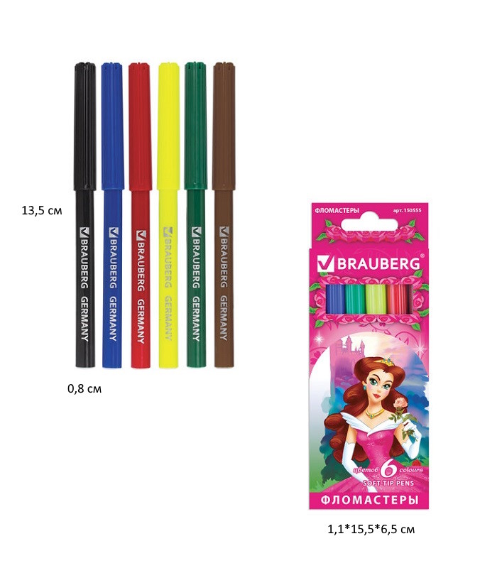 - кс_Фломастеры арт. 150555 BRAUBERG "Rose Angel", 6 цветов вентилируемый колпачок, картонная упаковка×кс_Фломастеры арт. 150555 BRAUBERG "Rose Angel", 6 цветов вентилируемый колпачок, картонная упаковкаРисование фломастерами способствует развитию воображения, мыслительных процессов, мелкой моторики рук у детей, координации движений кистей и пальцев и повышает способность концентрироваться и фокусировать внимание. Обладают яркими насыщенными цветами в количестве 6 штук. Благодаря толщине линии письма 1 мм и диаметру пишущего узла 1,8 мм процесс раскрашивания становится легким. Длина письма составляет 500 м: такого расхода хватит надолго. Фломастеры изготовлены на водной основе, поэтому они безопасны и легко смываются с большинства материалов и кожи. Полипропиленовый корпус значительно продлевает срок службы фломастеров. Колпачок имеет специальные прорези для вентиляции, которые способствуют прохождению воздуха при попадании в дыхательные пути. Рекомендованы для детей от 3-х лет.
