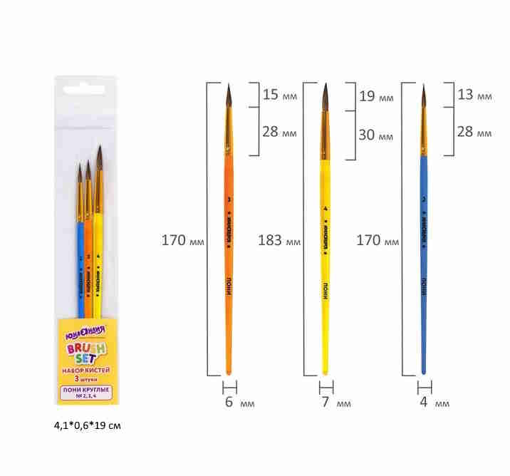 кс_Кисти арт. 201073 ПОНИ набор 3 шт. круглые № 2,3,4 пакет с европодвесом ЮНЛАНДИЯ