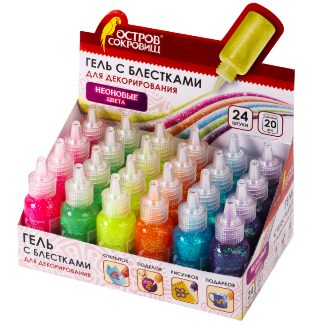 - кс_Гель с блестками арт. 662261 ОСТРОВ СОКРОВИЩ, 20 мл, неон, цв. ассорти, в дисплее×кс_Гель с блестками арт. 662261 ОСТРОВ СОКРОВИЩ, 20 мл, неон, цв. ассорти, в дисплееГель с блёстками для творчества и декорирования поделок из бумаги, картона, дерева, пластика и других материалов. Удобный наконечник с дозатором позволяет легко наносить гель на любую поверхность.