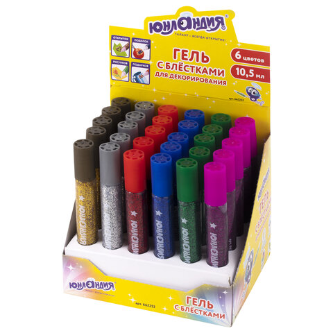 В дисплее содержится 24 тубы геля с блёстками объёмом 20 мл, представлены в 6 различных цветах: голубой, фиолетовый, розовый, оранжевый, жёлтый, зелёный.